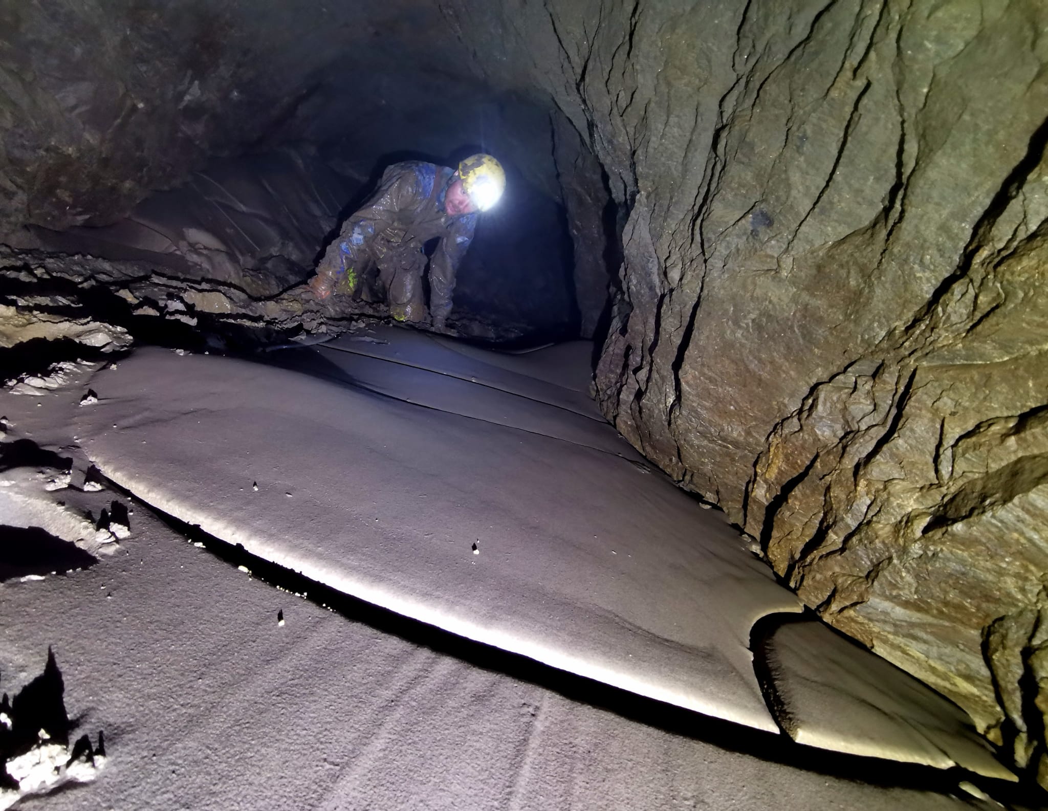 Back in the chamber Jon had found another way on upstream although this was now dry with huge mud cracks in the floor. After not too long this also ended in a terminal choke. Feels like this is below a large mined chamber in the original Wet West section, so makes sense.