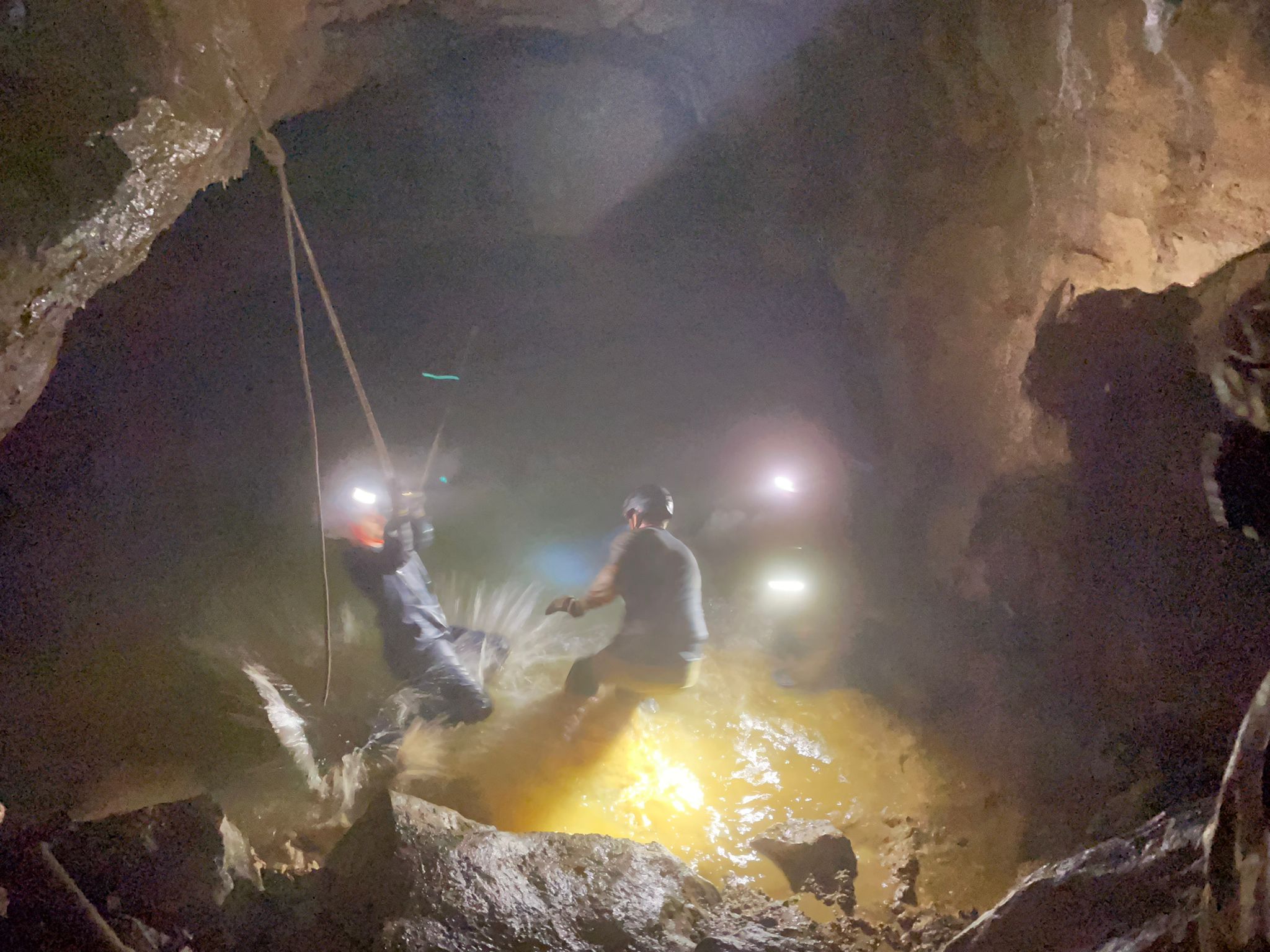 After a short break during which the first-timers marvelled that caving isn’t all tight, muddy suffering, we tackled the second boulder choke. This involved negotiating a few drops, but communication along our single-file line was excellent, and we made it to the final chamber without incident.