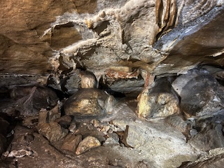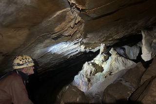 We made our way down into the bottom chamber. It is a good size chamber with gour pools in the floor and massive square blocks of rock throughout. There we saw the historic graffiti and beautiful stalagmites. The roof is decorated nicely and the calcite crystals gleamed in our lights. We followed it down to several dig sites and took our time to explore the nice chamber. We took some photos and then slowly made our way back out of the maze. Once reunited we still had time to slog off through the field to make our way to the Miners for a chat and a drink.