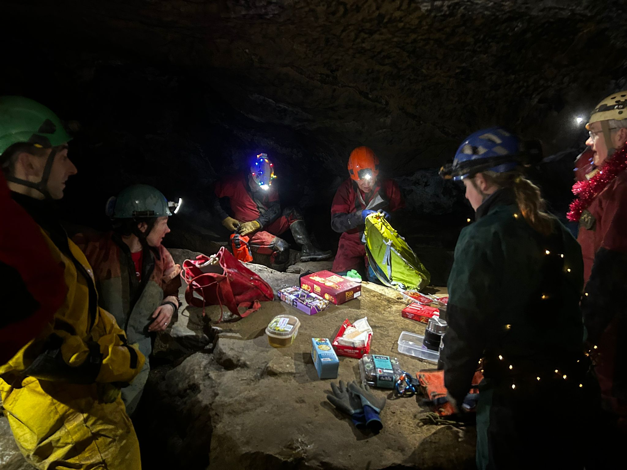 The Twelve Disciples of Tuesday gathered this week for our annual festive pilgrimage underground. Julian, Katie, John, Edvin, Chris (twice), Kat, Katie (also twice), Rob, Rich, Alan and Victoria assembled, while Jess met us in the car park armed with generous provisions to share. Sadly, her knee isn’t quite cave-ready yet—we missed you, Jess.