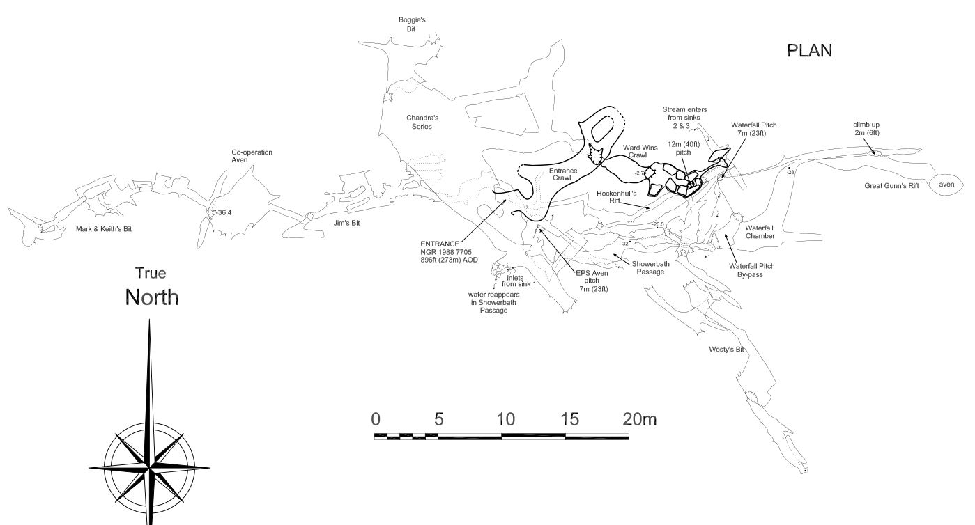 We headed down to the entrance in Waterfall Swallet, a surprisingly scenic circular depression with a huge waterfall crashing opposite the cave mouth. The entrance itself, however, was far less inviting: a downward-sloping, headfirst, flat-out crawl about 10 metres long, complete with broken glass and the fear of meeting a cornered badger. Jon went first to check that the coast was clear, then I followed. At its worst, the crawl took a bit of brute force and sideways head action, but was nothing our peak masculine, slender physiques couldn't handle.