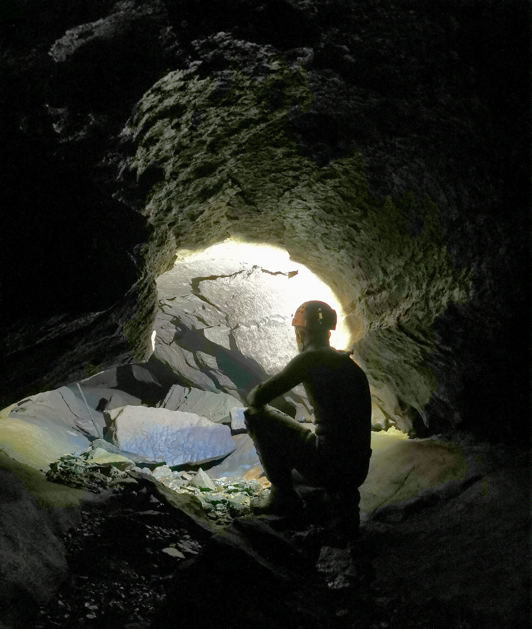 Beyond a low gravel crawl had to be dug open which took 5 or so minutes. I think this is called the “Sand Blaster” and according to John Beck’s old notes it also needed to be dug in 1976 and 1990, the only other two years that I’m aware this cave has opened. After this it’s easy hands and knees crawling for ~200m through Friday 13th Passage until a large T-junction is reached and shortly after the choke up into Twilight Zone. I climbed up the choke very waringly and for good reason as from above it looks awful, big boulders perched everywhere. This put me into a tall, drippy chamber with what looked like a few ways off at the top, but I carried on the obvious and draughty route back down the other side of the choke towards the Thursday 13th Passage, the breakthrough point from 1990.