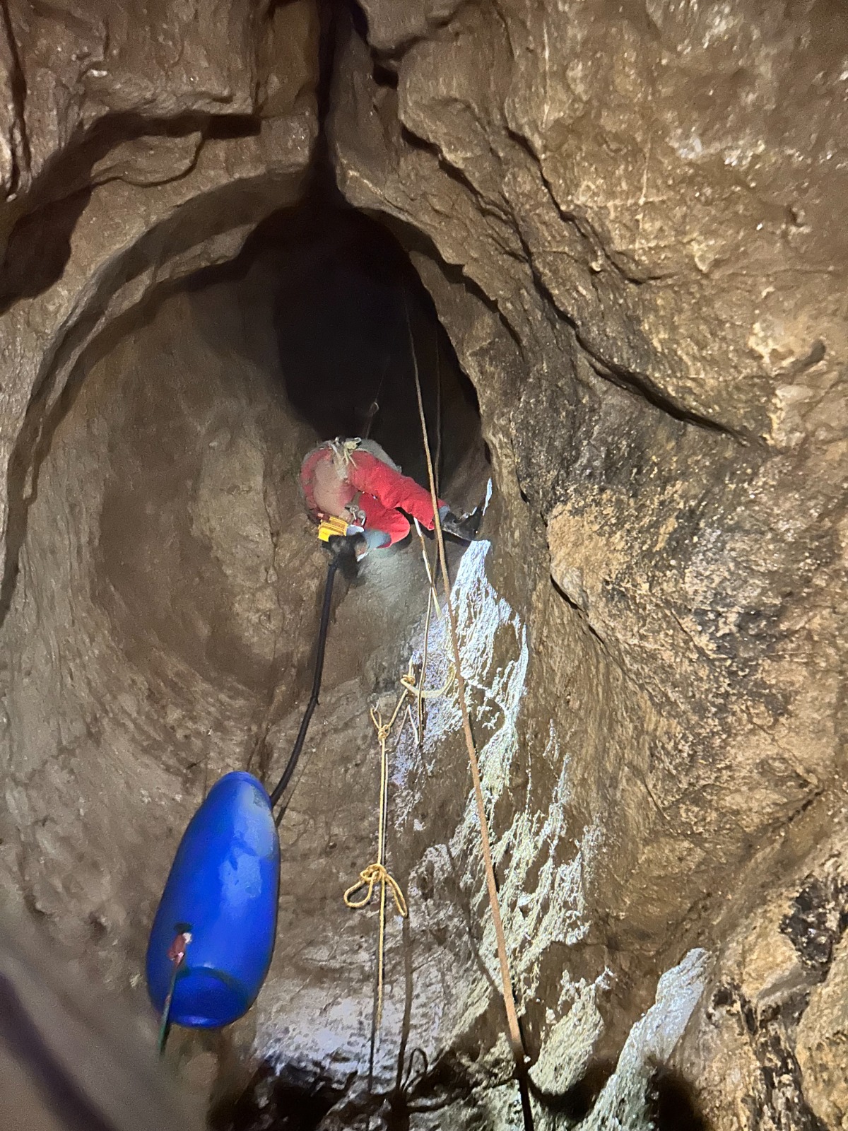 John agreed to rig and off he went. Grace is a regular to this spot, John hadn’t been in quite a while , for Bernie it was donkey’s years and this was my first time. John did a great job rigging and noticed when he got to the last bolting that you use the in situ rope to the floor. Good thing as the rope we brought was a tad too short. Down and a nice explore along the rift. Fun little traverse..whoever did that was ace. Phil? We explored down the next pitch to the dig and it is nice to see how far it goes and goes. Nice bit of conservation tape in place as well. Only one of us wanted to derig so out we went.